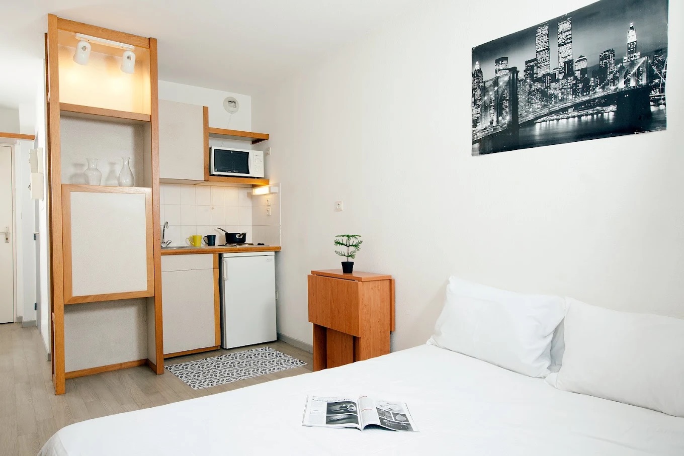 Un studio comprenant : une entrée, une salle de séjour avec coin cuisine et une salle de bains-water closet.